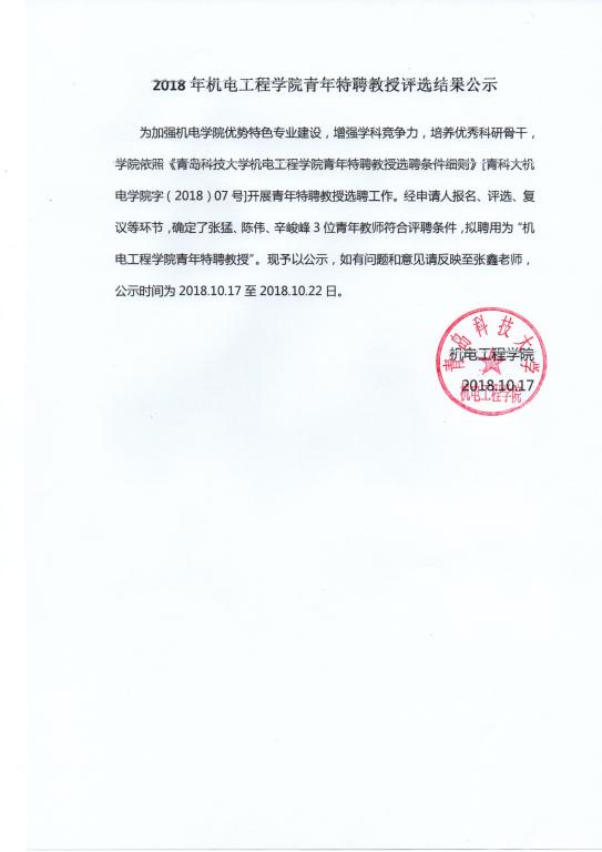 关于2018年开云kaiyun官方网站青年特聘教授评选结果公示