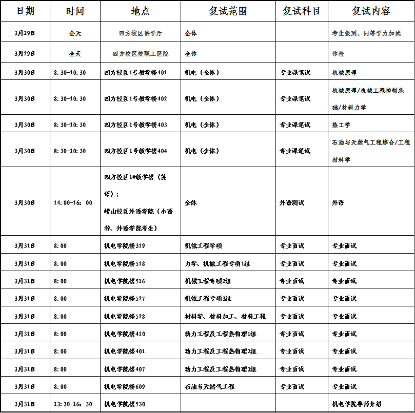 说明: 3月29日报到时,请在报到处--开云官网举牌位置填写报到登记详情表;3月30日专业课考试科目《机械原理》的考生请自带绘图工具;3月31日专业面试分组名单详见当天开云官网楼一楼张贴,各复试专业按照公布名单的顺序依次进行,政审表在面试时请交于各组政审老师;529房间为考生面试候场处。