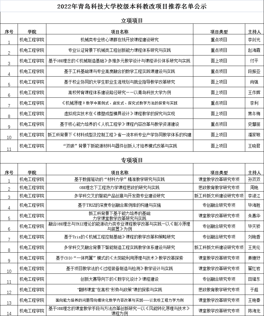 根据学校《关于开展2022年度校级本科教学改革研究项目和专项项目立项申报暨2020年度项目结题工作的通知》要求,学院开展了校级教改立项项目和专项项目的评审工作,经项目负责人申报,学院材料初审,院外专家评审,共拟推荐立项项目11项,专项项目14项,进入校评环节。现将结果公示如下: