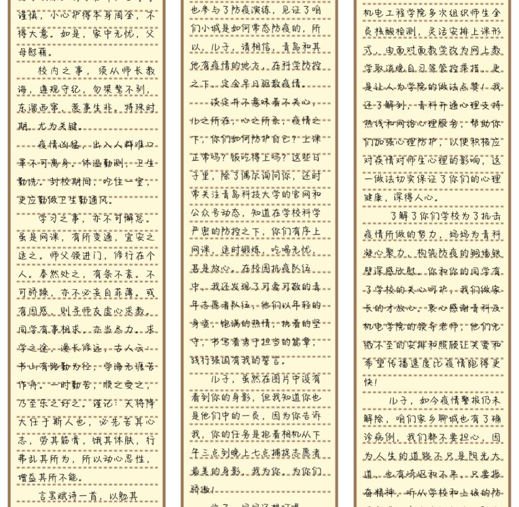 前段时间,青岛疫情形势严峻,父母与孩子远隔山河,家书成了父母与孩子之间唯一的沟通桥梁。父母的殷殷嘱托、谆谆教诲以及附在家书上的思念与担忧牵动着孩子们的心,也给疫情中的同学们打了一针强心剂。