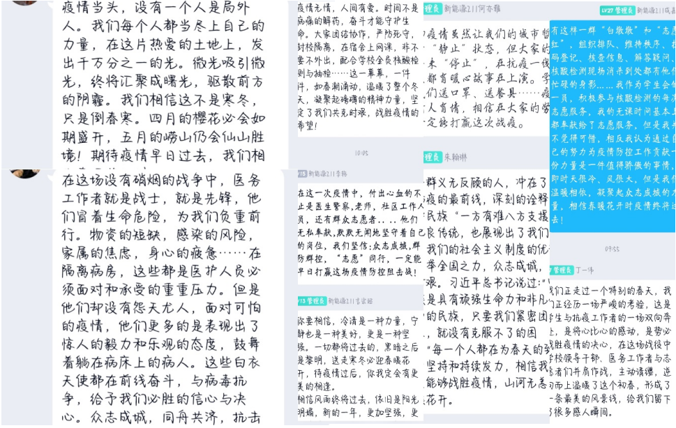 面向年级学生征集“抗疫日记”,分享抗击疫情期间学习、生活心得、收获与感悟,以学生喜闻乐见的方式,开展心理健康活动,搭建沟通桥梁,增进同学们相互理解交流,隔离病毒不隔离关爱,传递积极向上正能量。