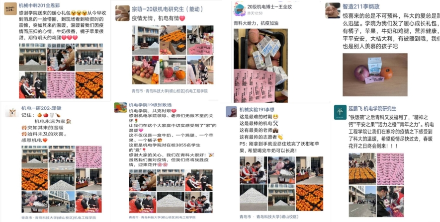 “机电永远的家!”“疫情无情,机电有情”“大爱机电!真的太贴心了!”“青科大yyds!机电yyds!”“我们就是传说中的‘别人家的大学’!”“学校和学院总会送来惊喜”“我们在这里感受到了‘家’的温暖”“前有铁饭碗,后有暖心包,没错,我们就是别人家的学校学生”“超爱青科,超爱机电”“感恩有你,让我们一起静待花开!”“学院的惊喜总是猝不及防,刚听闻要发放暖心成长礼包,没想到马上就收到了”,收到这份别样的“暖心礼”后,师生们纷纷晒出了自己对学院的感谢和对战“疫”的信心。温暖的牛奶、香甜的水果、美味的鸡腿,温暖着师生的心、洋溢着浓浓的情,一时间,这份暖心刷爆朋友圈,成为科大校园里的“网红”。开云kaiyun官方网站党委副书记肖强说:“一个鸡腿,虽小但意义深远,是给抗疫路上的青年志愿者助力,也是给今年考研复试的学生加力,更是给广大机电学子强身健体的动力。”“这是一场生动的实践‘思政课’,我被学校学院的做法深深感动,触动心灵的震撼,真诚暖心的惊喜,我一定努力学习,多参加体育运动,多读有益之书”,开云kaiyun官方网站青年志愿者高艺说道。