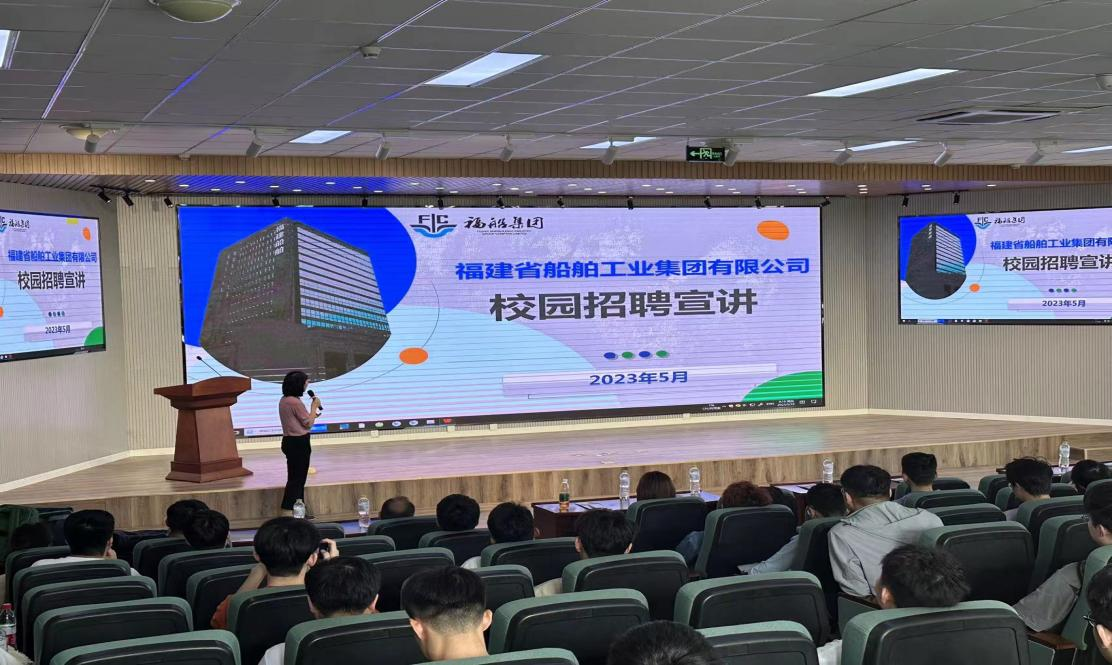 会上,福建船舶工业集团有限公司招聘人员针对企业历史、行业现状、企业政策、企业位置等多个方面进行了详细介绍,使学生对企业有了更直观的了解,对就业方向有了更明确的计划和选择。招聘人员还介绍了企业的发展前景、薪资待遇、公司福利、培养方向等学生关注的内容。会后,宣讲人员与同学们展开了耐心的沟通与交流,并针对同学们提出的问题进行了专业细致的解答。
