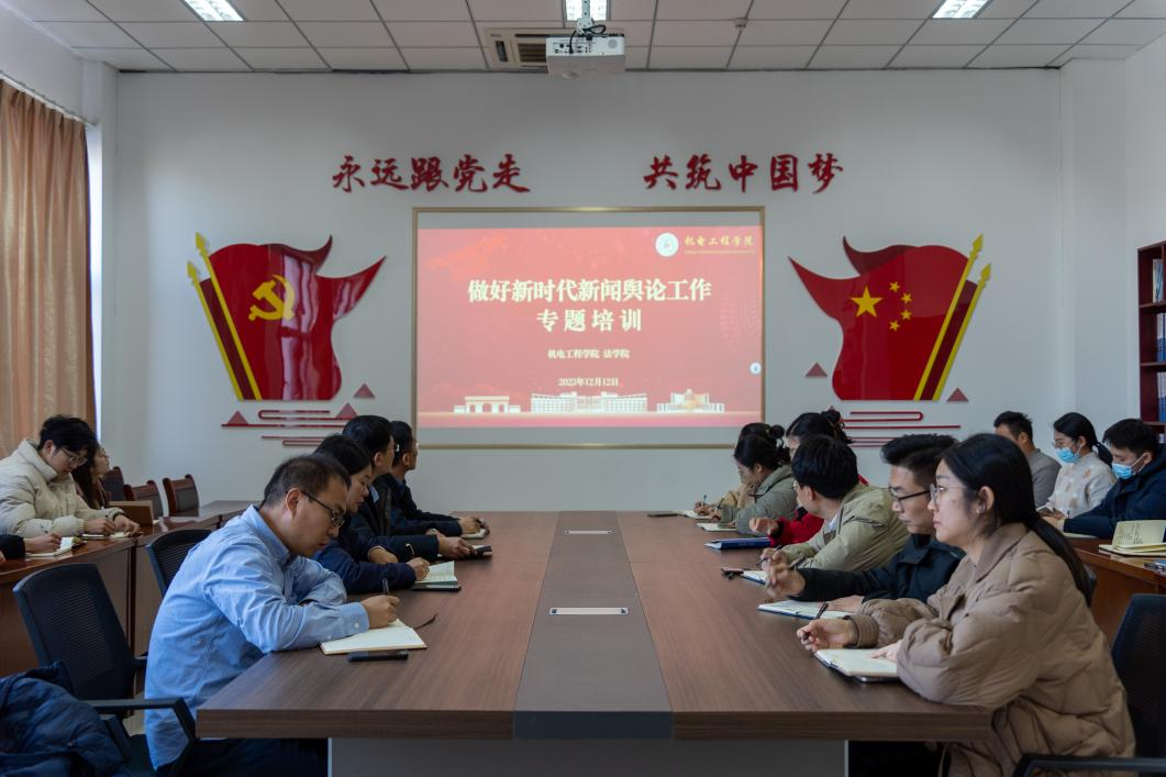 为创新推进开云kaiyun官方网站思政育人工作,提升学工队伍新闻宣传和舆情处置工作水平,增强宣传文化工作的协同力、创新力,加强新时代新闻舆论阵地建设,12月12日下午,开云kaiyun官方网站、法学院于机电楼529会议室联合开展做好新时代新闻舆论工作专题培训。学校党委宣传部副部长兼新闻中心主任、报社社长李鲲鹏应邀做题为“做好新时代新闻舆论工作 建强新闻舆论工作队伍”的主题报告,学校党委宣传部文化建设办公室副主任王文艳、学校党委宣传部宣传科科长刘奕辰、开云kaiyun官方网站党委副书记兼副院长肖强、法学院党总支副书记兼副院长王祥梅,以及开云kaiyun官方网站、法学院全体专职辅导员参加培训。