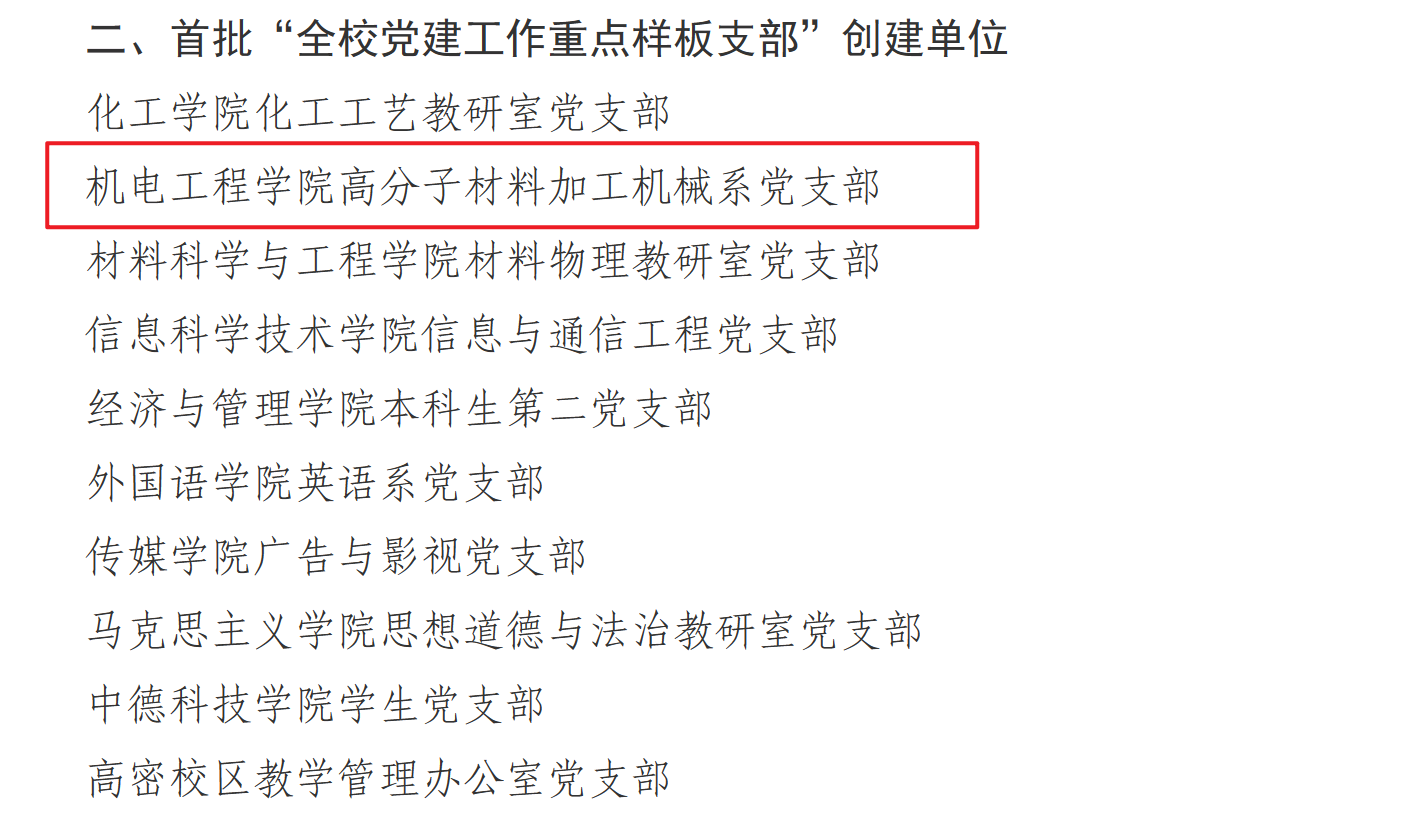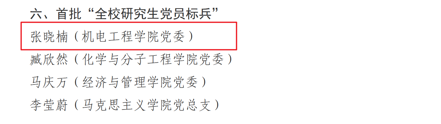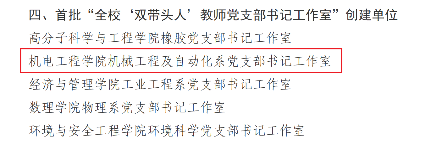 开云kaiyun官方网站党委荣获多项佳绩,其中,学院党委入选首批“全校党建工作标杆院系”创建单位,高分子材料加工机械系党支部入选首批“全校党建工作重点样板支部”创建单位,机械工程及自动化系党支部书记工作室入选首批“全校‘双带头人’教师党支部书记工作室”创建单位,2022级硕士研究生张晓楠入选首批“全校研究生党员标兵”。