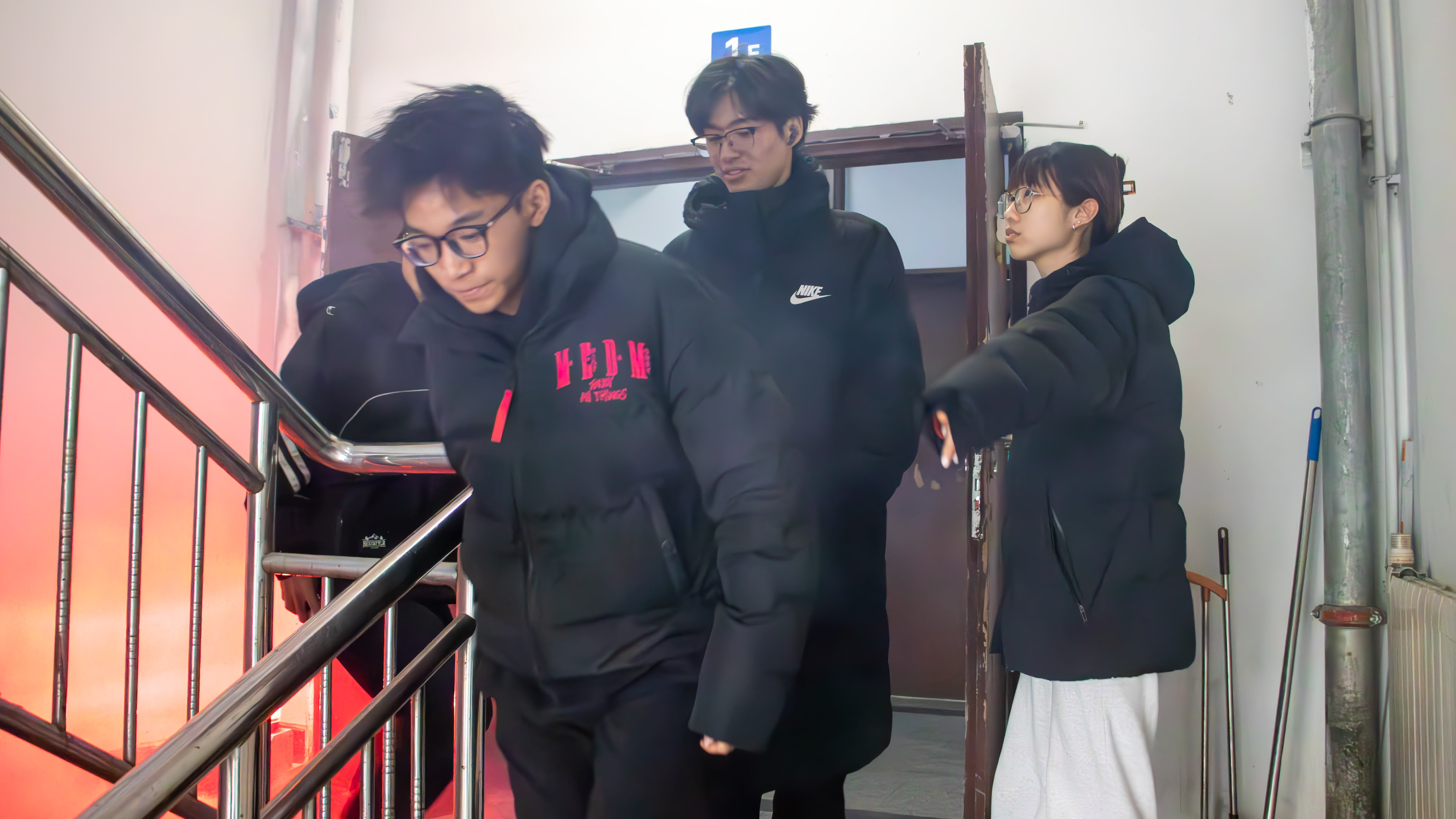 随后,在崂山校区北2舍、北3舍开展了消防疏散演练。警报声响起,同学们迅速反应,按照培训要求,用湿毛巾捂住口鼻、弯腰前行,沿预定路线迅速而有序地撤离到安全区域。疏散过程中秩序井然,到达集合点后,各宿舍立即点名确认,班长核实全员安全撤离并上报情况。