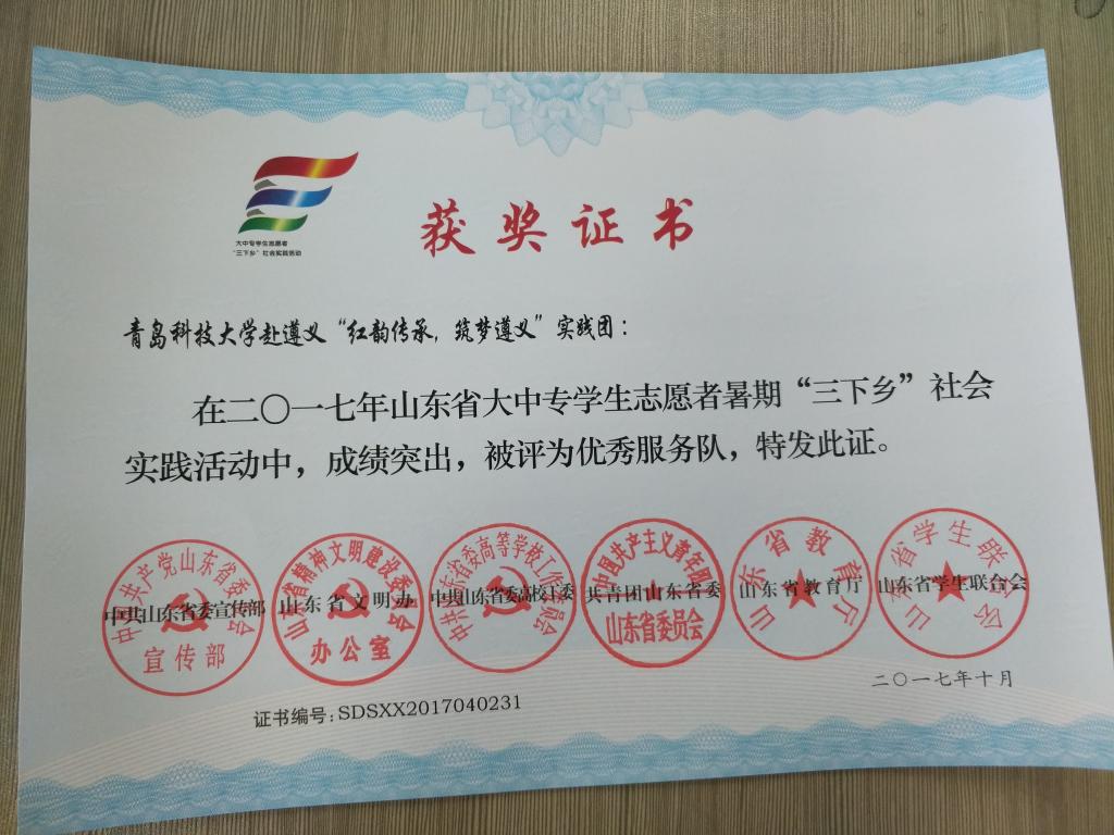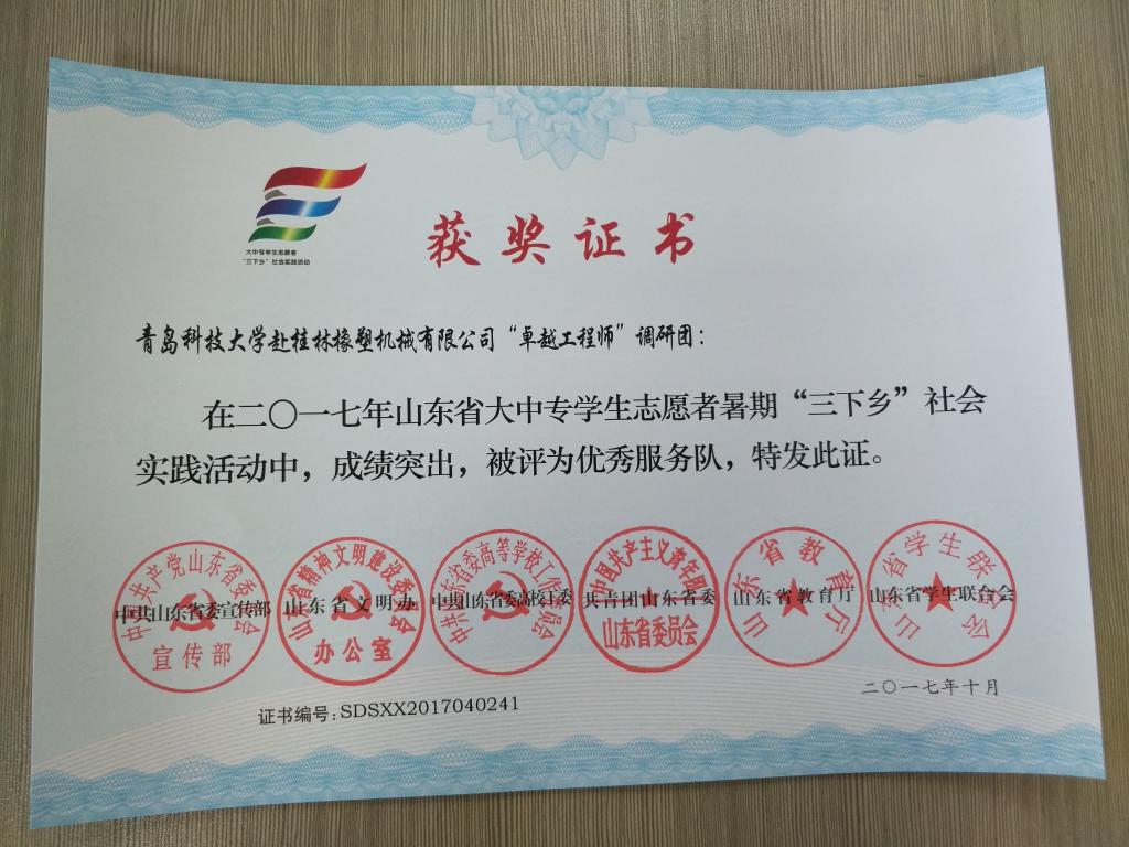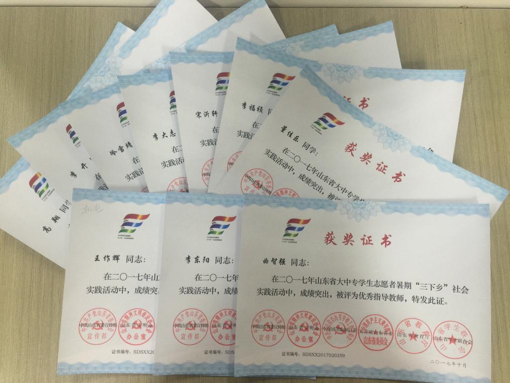近日,2017年山东省大中专学生志愿者暑期文化科技卫生“三下乡”社会实践活动先进集体和先进个人的证书下发,开云官网赴桂林橡塑机械有限公司“卓越工程师”调研团、赴遵义“红韵传承,筑梦遵义”实践团2支队伍获得2017年山东省优秀服务队称号,王作辉、曲智强、李东阳被评为2017年山东省社会实践活动优秀指导教师,高翔、李开、冷雪靖、李大志、宋沂轩、李福祯、董佳乐7名学生荣获2017年山东省社会实践活动优秀学生。
