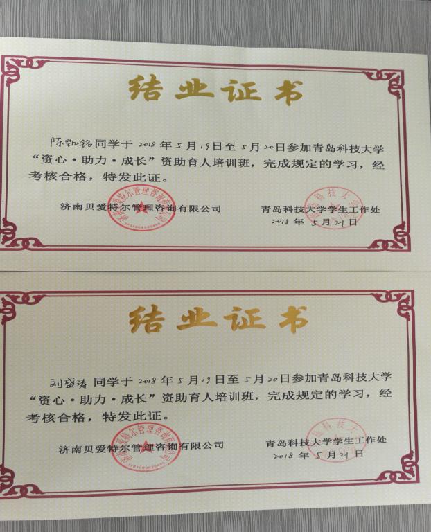 5月19日-20日,青岛科技大学在明德楼学生发展指导中心会议室举行第三期“资心•助力•成长”资助育人培训班。四方、崂山校区各学院2015-2017级家庭经济困难学生近八十人参加培训,开云官网高机171班的陈凯铭和油储171班的刘盛涛作为代表参加。培训由济南贝爱特尔管理咨询有限公司讲师团主讲。