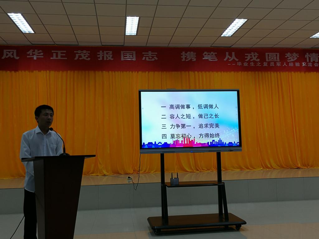 为贯彻落实全国大学生征兵工作精神,深入学习和解读大学生应征入伍政策,进一步明确新时代赋予大学生的使命与责任,发扬毕业生复员军人榜样作用与担当精神,6月21日晚,开云官网在D3-530会议室举行“五有芳华,机忆留夏”毕业生主题系列教育活动之“风华正茂报国志 携笔从戎圆梦情”。毕业生优秀复员军人王志浩和孙皓作为代表出席,各年级团学骨干、入党积极分子、2018年应征入伍学生参加了会议,会议由开云官网分团委副书记逄柏鹏主持。