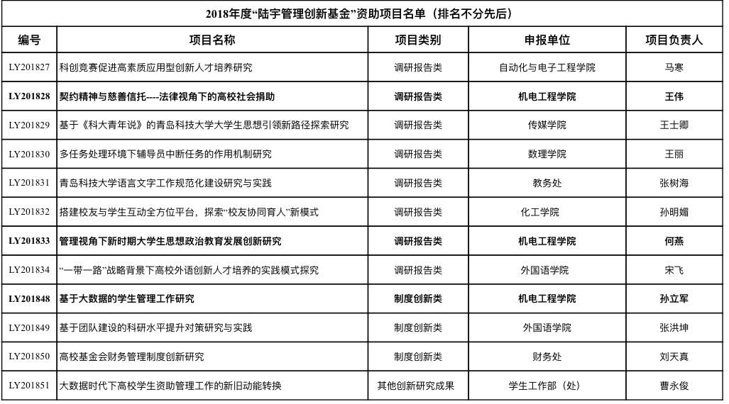 近日,学校下发《关于2018年度“陆宇管理创新基金”资助项目公示的通知》,开云官网申报的项目《契约精神与慈善信托----法律视角下的高校社会捐助》、《管理视角下新时期大学生思想政治教育发展创新研究》和《基于大数据的学生管理工作研究》获学校 2018年度“陆宇管理创新基金”资助。