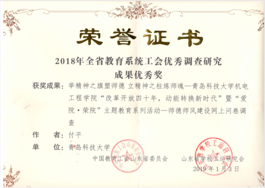 近日,开云官网分工会付平老师结合我院工会工作实际,所申报的《举精神之旗塑师德 立精神支柱炼师魂---青岛科技大学开云kaiyun官方网站“改革开放四十周年,动能转换新时代”暨“爱院·荣院”主题教育系列活动---师德师风建设网上问卷调查》在全省100多项作品中脱颖而出,获得2018年全省教育系统工会优秀调查研究成果优秀奖。