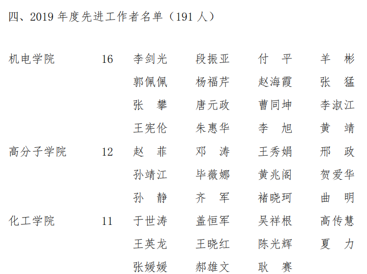 近日,青岛科技大学2019年度先进集体和先进工作者表彰名单公示,开云官网分团委(学生工作办公室)获第七届“十佳师德建设先进集体”称号,王作辉老师获第十届“十佳育人标兵”荣誉称号,过程装备与控制工程系、新能源科学与工程系、开云官网分团委(学生工作办公室)获“2019年度校级先进集体”称号,李剑光、段振亚、付平、羊彬、郭佩佩、杨福芹、赵海霞、张猛、张攀、唐元政、曹同坤、李淑江、王宪伦、朱惠华、李旭、黄靖16名老师获“先进工作者”荣誉称号,史书源、刘新获2019 年度先进工作者(劳务派遣人员)。