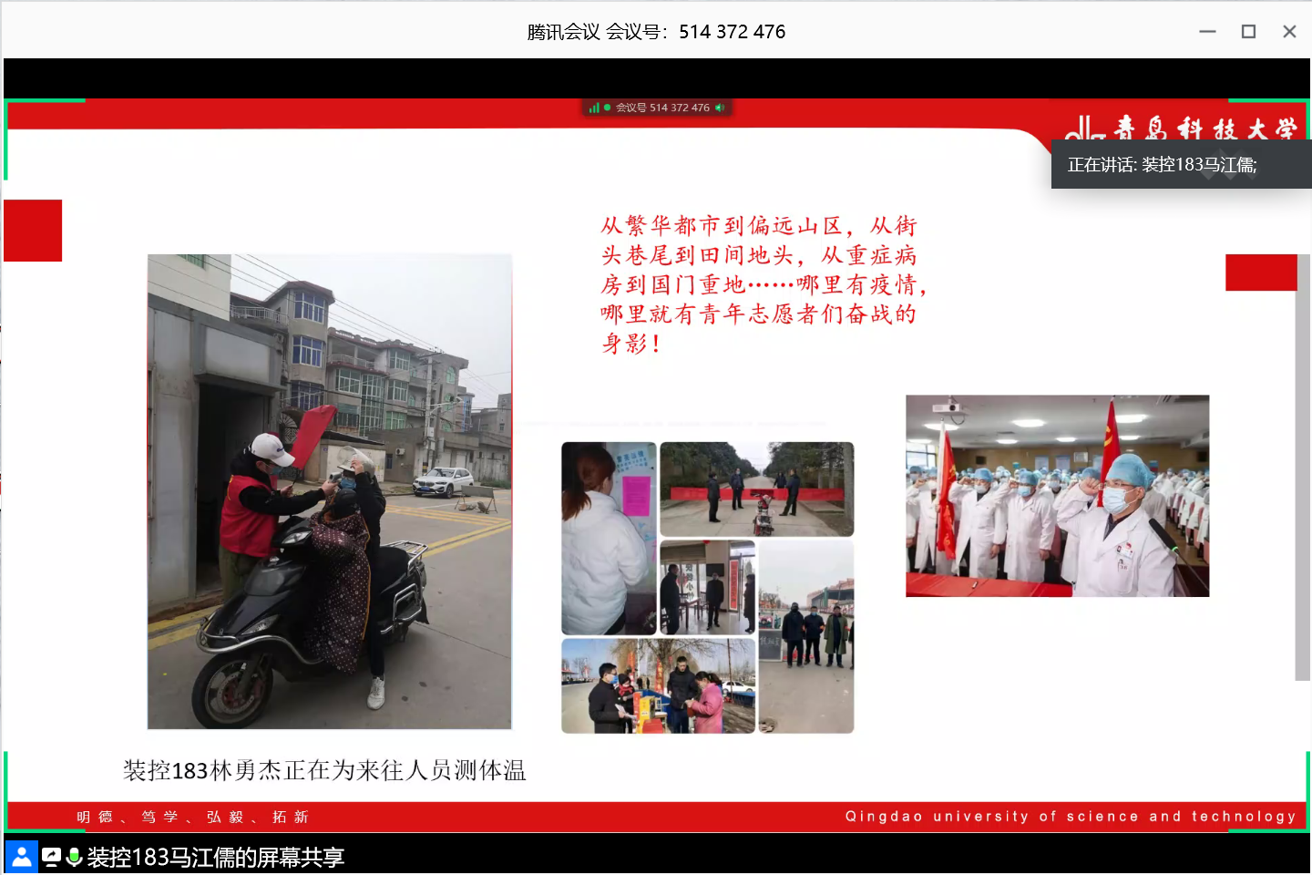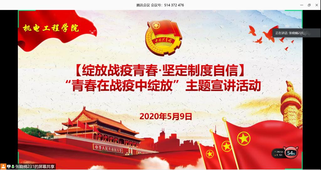 为深入贯彻落实习近平新时代中国特色社会主义思想对青年行动的指导,5月9日,在纪念五四运动101周年、新冠疫情防控阻击战取得重大战略成果之际,开云官网分团委组织部举办“青春在战疫中绽放”线上主题宣讲活动。分团委组织部部长王娟娟老师出席了活动,罗浩宇、刘龙、马江儒和马元宇四位团员作为机电团员青年战疫典型代表宣讲了他们勇战疫情的青春故事,17级、18级、19级200余名团学骨干通过“腾讯会议”参与了活动。活动由分团委组织部副部长张晓楠主持。