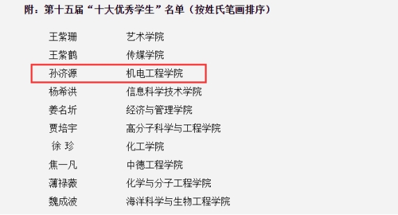 根据《青岛科技大学本专科学生荣誉奖奖励办法》(青科大字﹝2018﹞170号)和《关于评选青岛科技大学第十五届“十大优秀学生”的通知》(青科大学字〔2021〕9号)要求,结合学校实际,按照公开、公正、择优的原则,经学院(校区)推荐、资格审核、网络投票、现场汇报、民主投票等环节,现评选公示中,我院孙济源同学获得“十大优秀学生”。