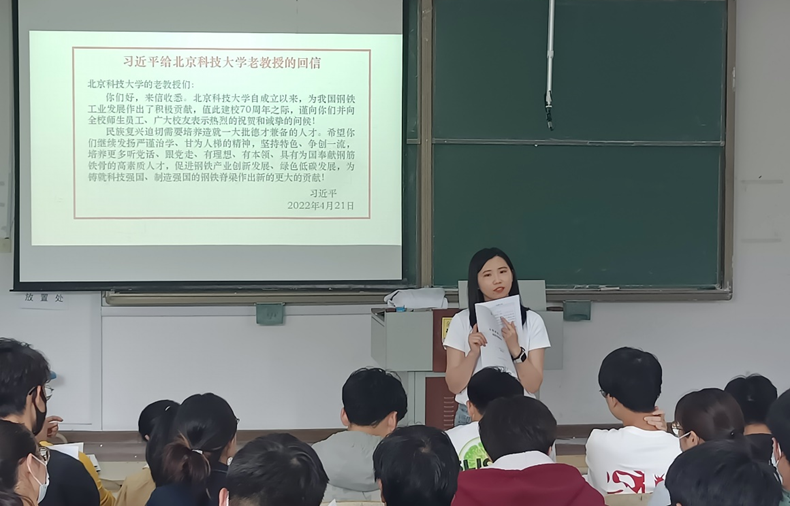 孙坤岩、管羽领读习近平给北京科技大学老教授的回信。管羽号召支部全体党员,要深刻领会习近平总书记在回信中的殷殷嘱托,埋头苦干,争先创优,成为祖国建设所需要的高素质复合型人才,为铸就科技强国、制造强国的钢铁脊梁作出新时代青年应有的突出贡献!