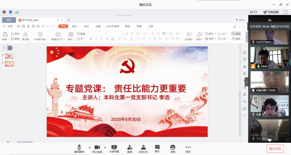 为贯彻落实全国全省基层党建工作重点任务推进会精神,根据中组部“党课开讲啦”活动安排、省委组织部和学校有关通知要求,按照学校《关于开展“我来讲党课”活动的通知》部署,6月30日下午,开云kaiyun官方网站本科生第一党支部书记李浩在腾讯会议主讲“迎七一”专题党课。全体学生党员参加党课学习,会议由王玉凯老师主持。