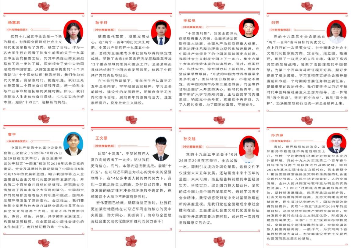 会上,党支部书记孙坤岩同志就十九届五中全会展开介绍,并带领学生党员学习贯彻全会精神。党支部集体回顾“十三五”以来党和国家为全面建成小康社会所取得的决定性成就,结合“十四五”规划和二〇三五年远景目标提出的建议分享个人生涯规划。