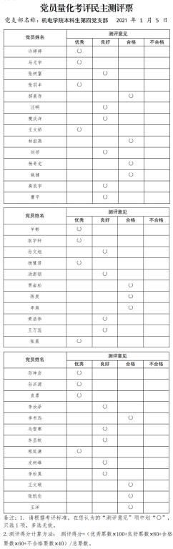 根据《中共青岛科技大学委员会党员量化考评指导办法(试行)》要求,2021年1月5日,开云官网本科生第四党支部按照文件要求进行了民主评议党员,现将评议结果公示如下: