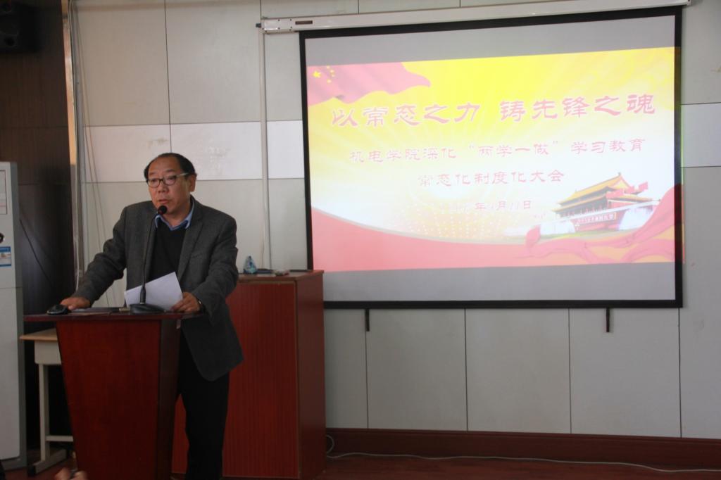 学院党总支副书记兼副院长王伟传达了《关于推进“两学一做”学习教育常态化制度化的意见》,并从明确基本目标要求、精心安排学习内容等八个方面带领党员进行学习。