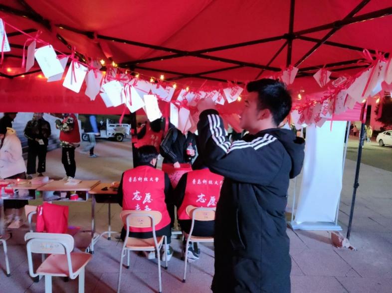 随着时间的推移,活动现场的同学逐渐多了起来,每个志愿者都在尽心尽力的向同学们普及和宣传防艾知识,同学们也对积极参与我们的活动。每一个参与活动的同学都会亲手写下一份带着自己防艾决心的卡片,他们被挂在帐篷之间,随风起伏,象征着每个人对防艾的热情,以此提高同学们的防艾意识。