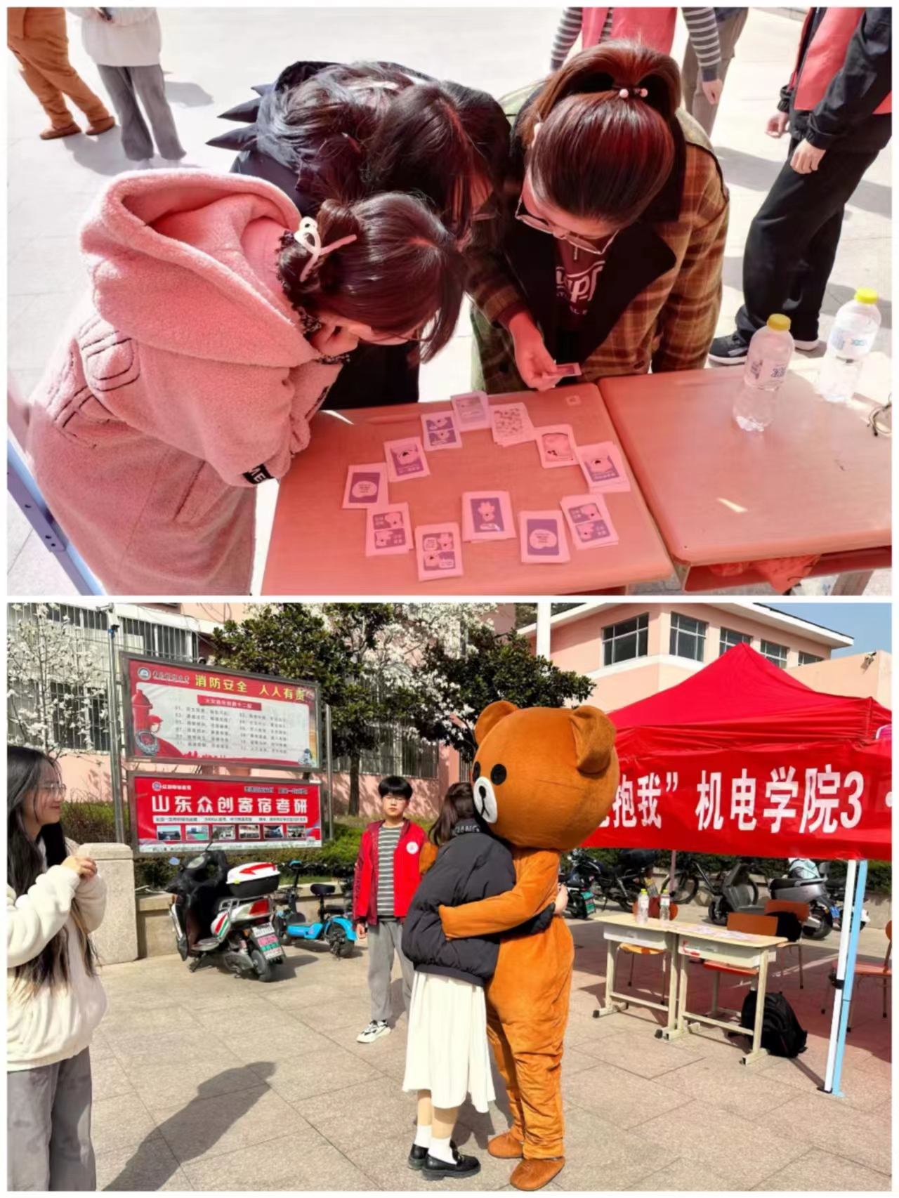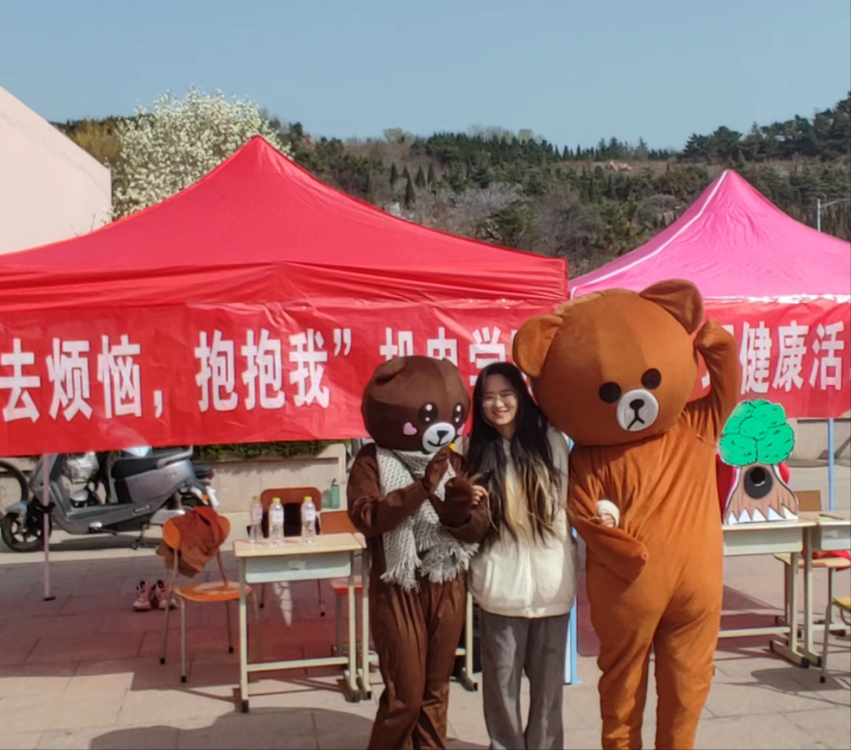 第三个活动——拥抱大熊,去除烦恼。每个人在烦恼无助的时候,往往需要一个控制情绪的依靠。大熊正是健康、积极、阳光的代表。通过拥抱大熊,每个人的烦恼会随着拥抱挥之而去。大熊给予的温暖怀抱使同学们心灵充满希望。此外我们发放祝福小卡片,对同学们给予祝福。