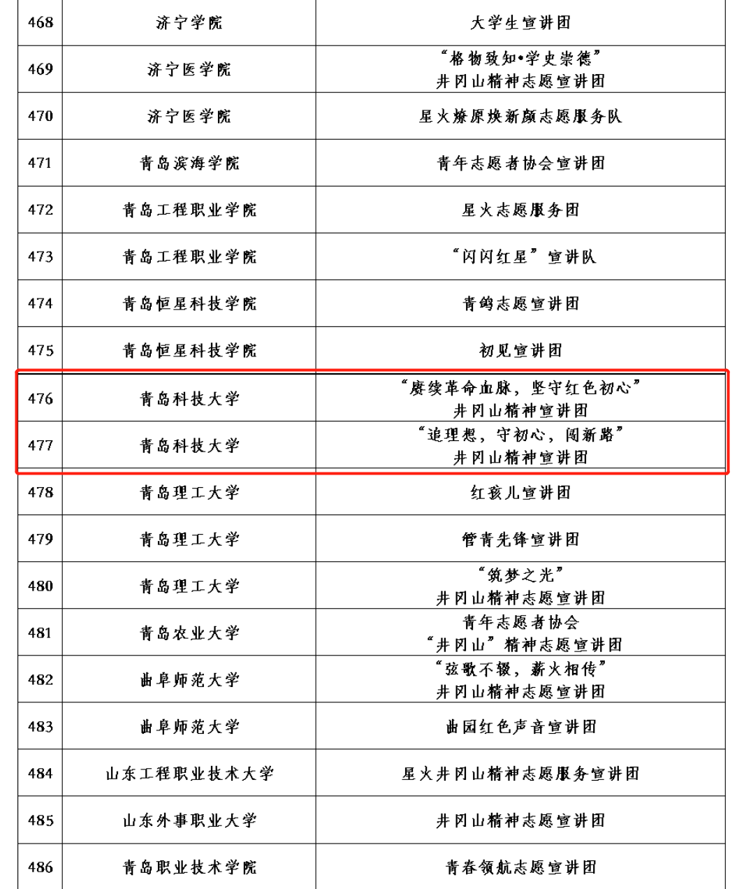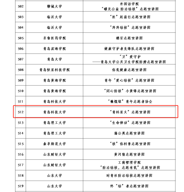 近日,团中央青年志愿者行动指导中心公布2023年全国大学生“两弹一星”精神志愿宣讲团、“防治结核 志愿有我”志愿宣讲团、井冈山精神志愿宣讲团、“七彩假期”志愿服务示范队入选名单,青岛科技大学共11支团队入选,其中开云kaiyun官方网站5支,为学院参与全国千支大学生志愿宣讲团选拔最好成绩。