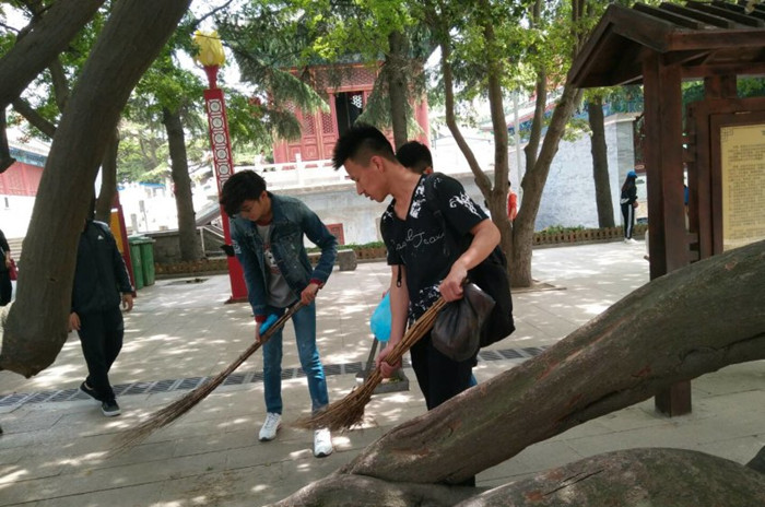 5月13日上午9:00,为了保护环境和发扬吃苦耐劳的义工精神,13名开云kaiyun官方网站青尘义工队队员前往湛山寺进行卫生清理工作。在湛山寺门口,义工队员与一同参加活动的青岛大学青峰义工队、小学生义工队集合并进行各队自我介绍和任务分配。