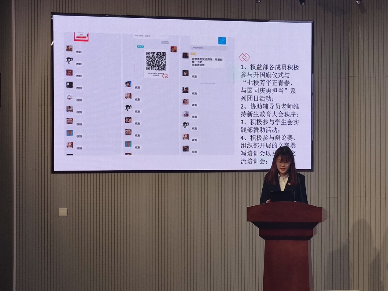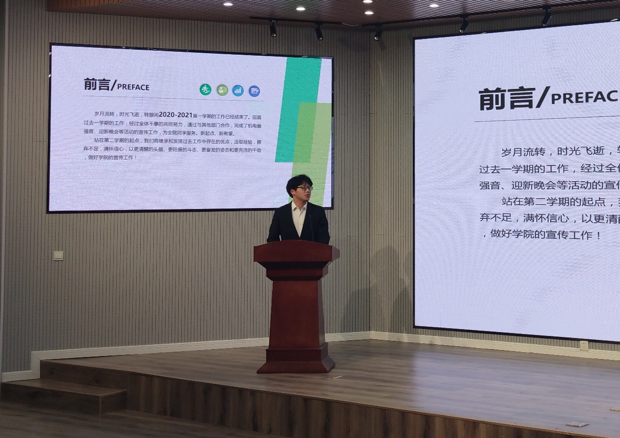会议第二阶段,为全面落实2020-2021学年度第一学期开云官网学生会的工作开展情况,各部门针对本部的工作情况面向学生会全体同学进行述职汇报 。