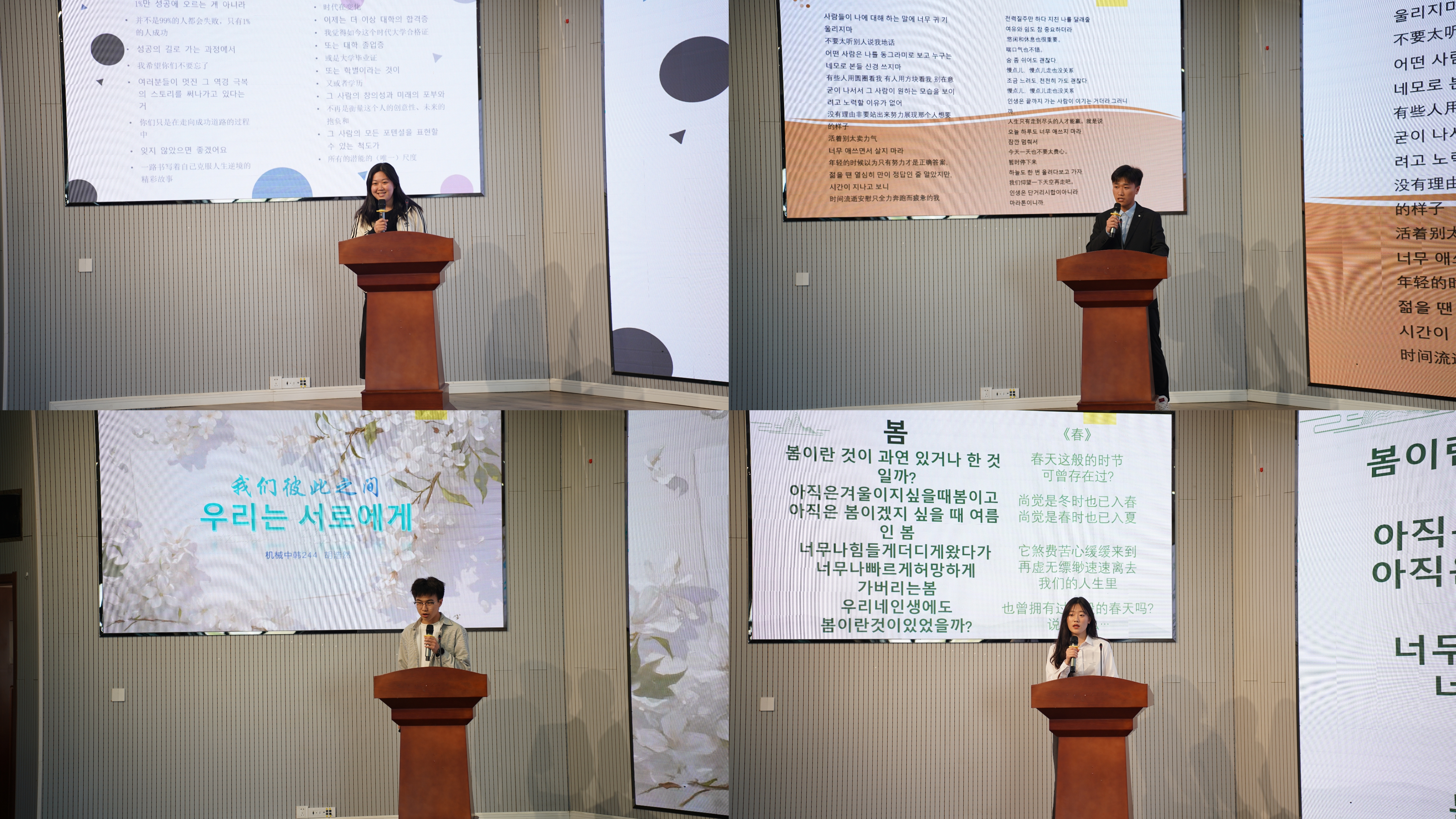 韩韵悠悠耳畔响,诗风缕缕润心田。2025年4月29日下午,开云kaiyun官方网站成功举办“诵读韩韵,声动人心”第一届韩语朗诵大赛。此次大赛旨在提升学生韩语水平,激发韩语学习兴趣,吸引了机械工程(中韩合作办学)专业、材料成型及控制工程(中韩合作办学)专业学生的广泛参与。开云kaiyun官方网站副院长李剑光、合作办学办公室主任付平、中韩合作办学师生代表80余人参加此次活动。韩语教师刘雪云、马敏、李静作为本次评委。